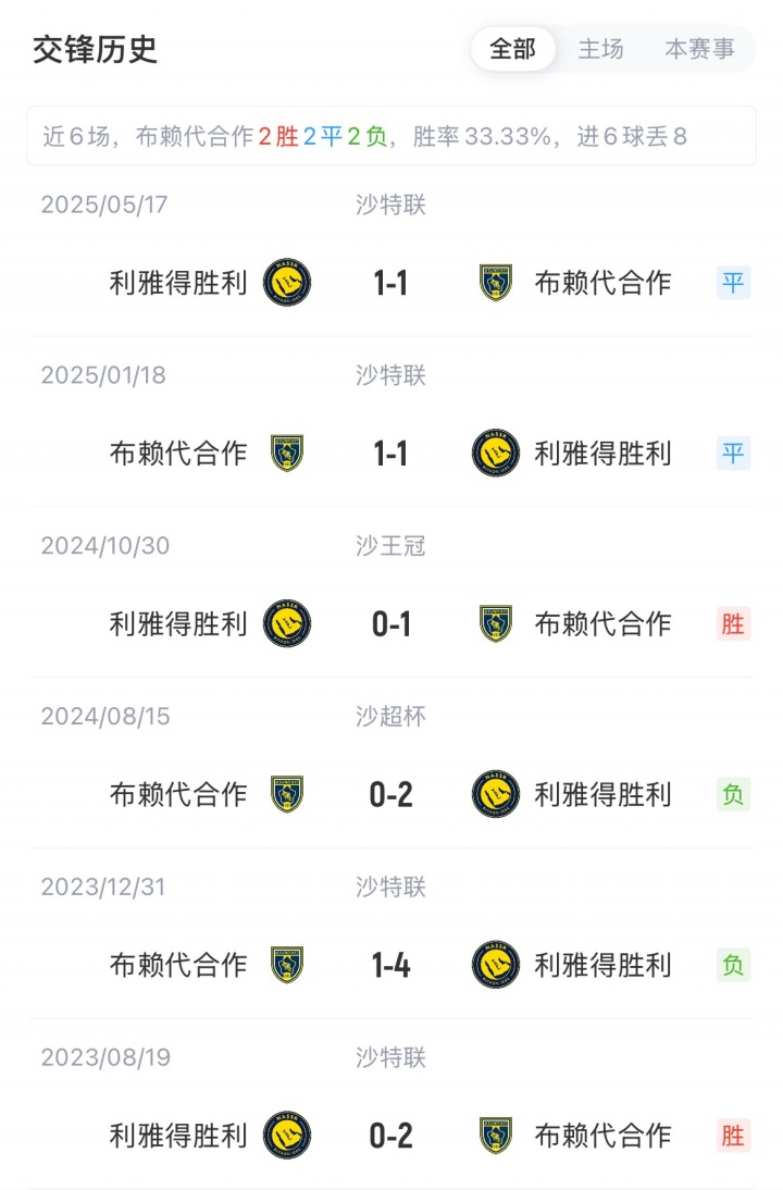历史交锋记录显示,利雅得胜利上赛季位列联赛第三,布赖代合作排名第八,最近三次交锋主队取得2平1负的战绩。