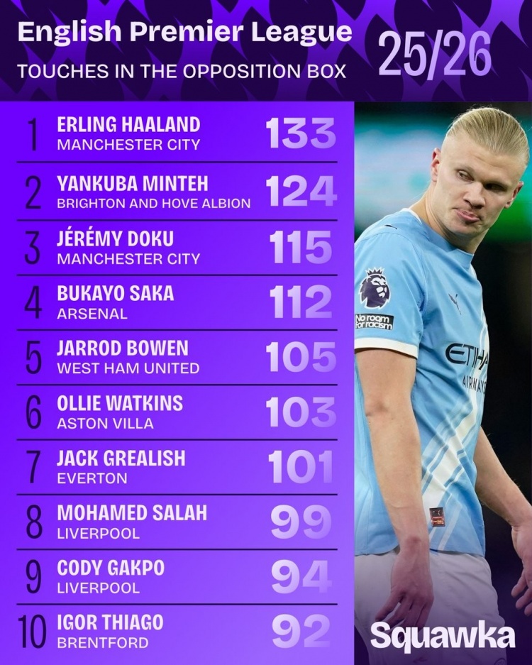 1月10日讯 数据机构squawka统计了本赛季英超在对方禁区内触球情况,哈兰德领跑。