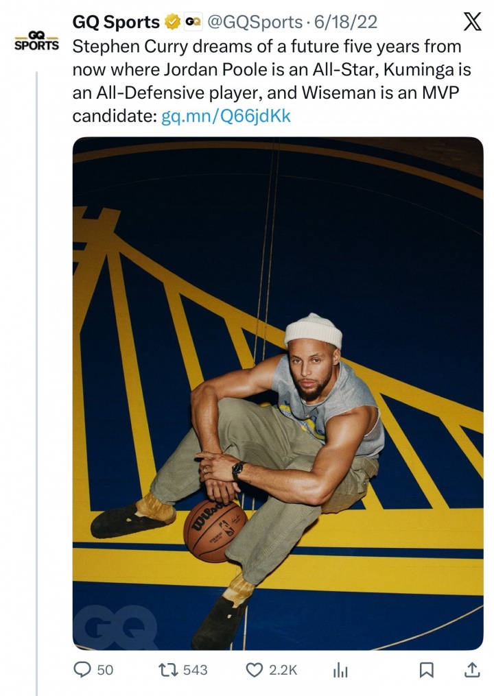 库里当时的梦想是,5年内普尔能够成为全明星,库明加能够进入最佳防守阵容,怀斯曼能够成为MVP候选人。